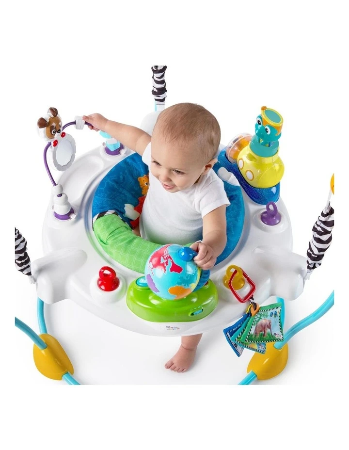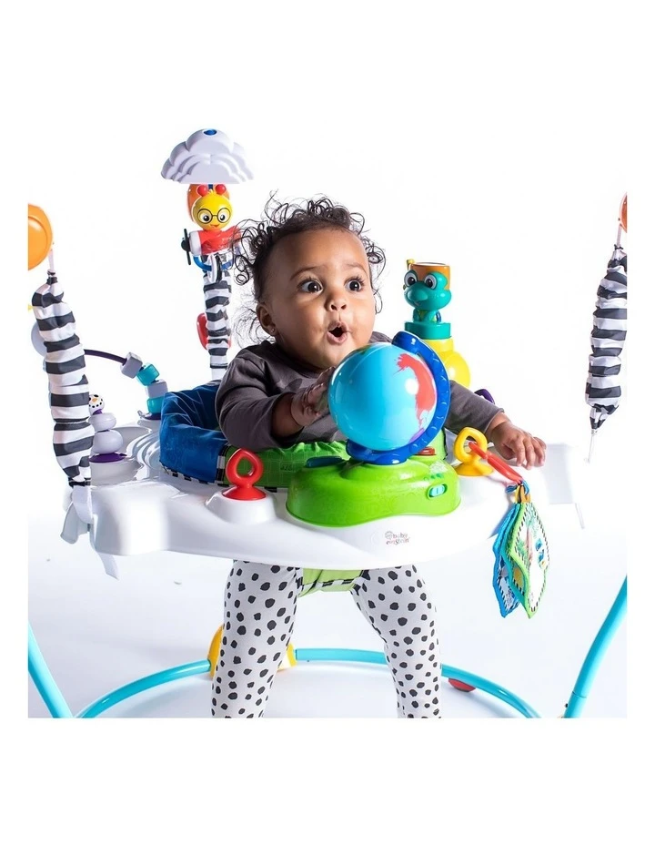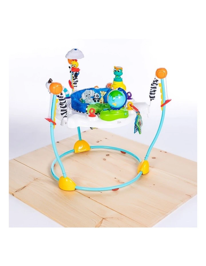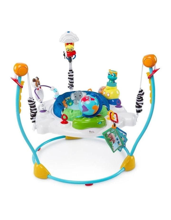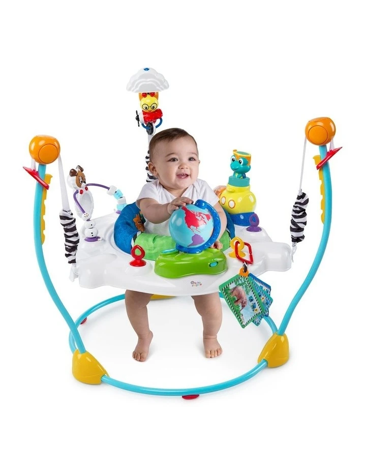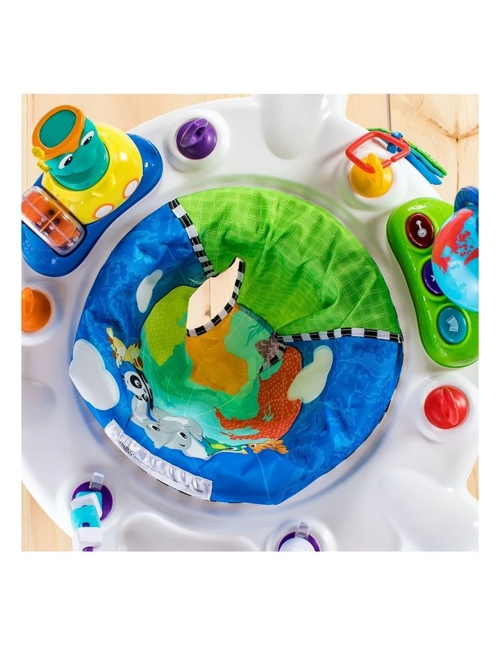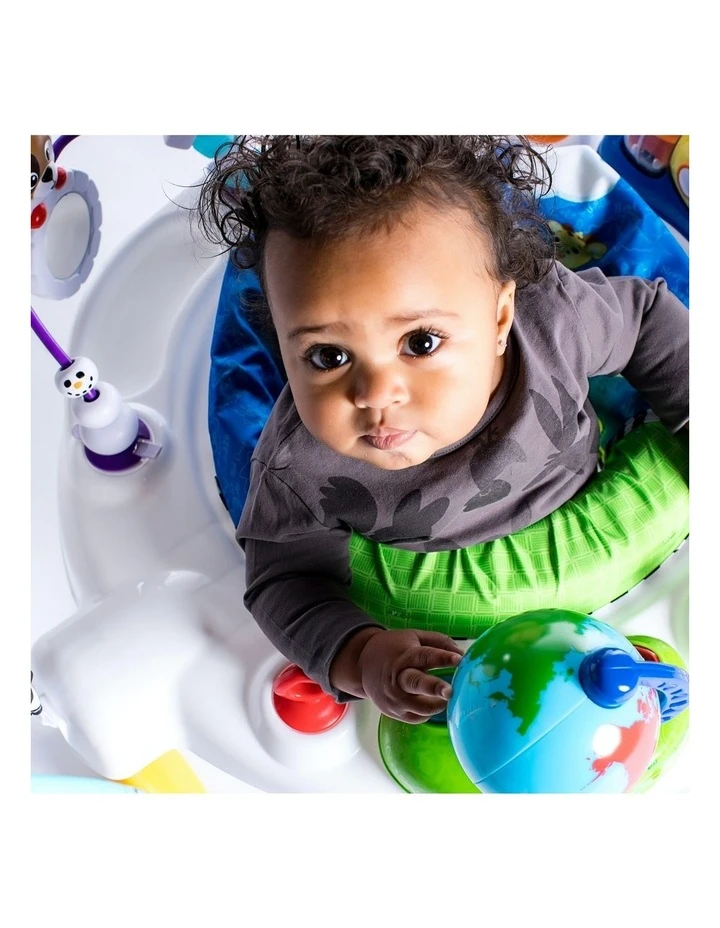 The standing jumper is made for growing babies, so the four height positions are easy to adjust. Its bouncy seat rotates 360 degrees, while supporting baby with a comfy, machine washable seat pad and high seat back. It’s easy to move this activity center from room to room as your baby jets off on his Journey of Discovery.