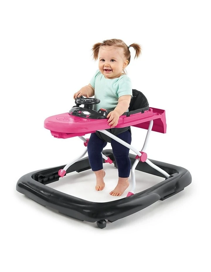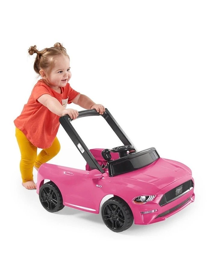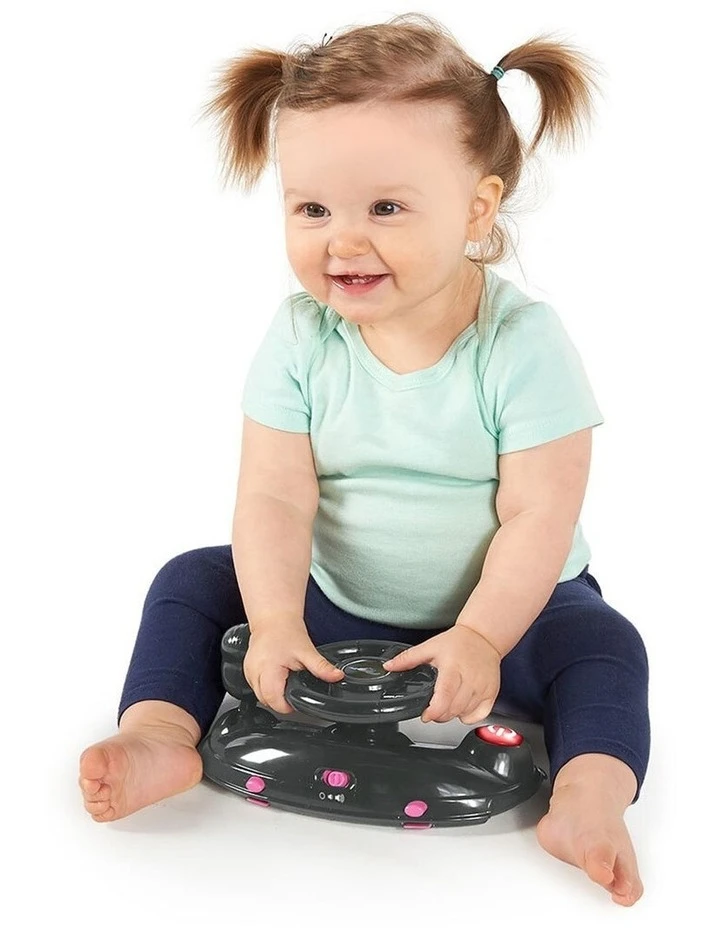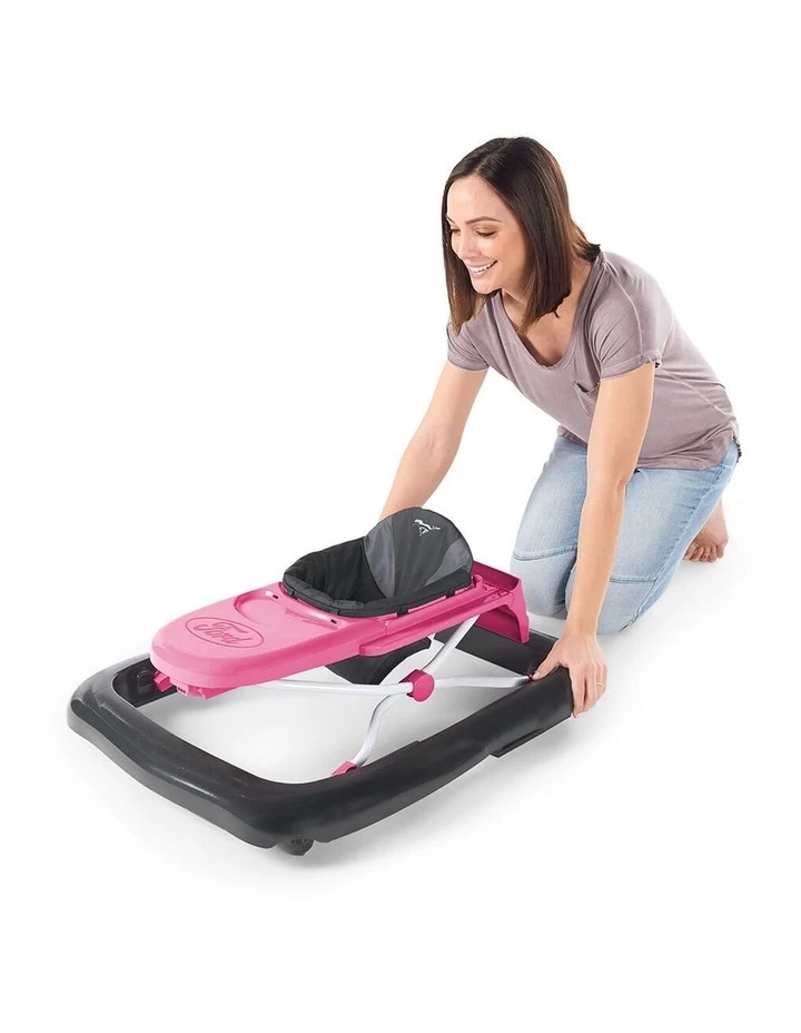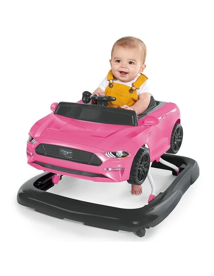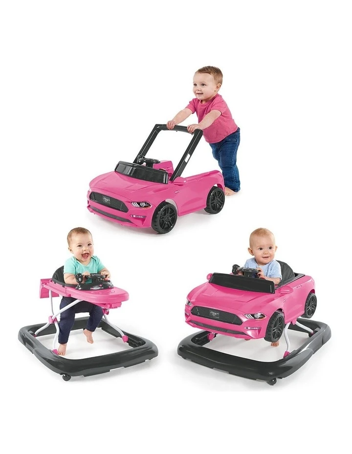 Ford and Bright Starts bring families together to put the power into playtime. Encourage baby to Go Further with Ford in the 3 Ways to Play Walker – Ford Mustang.Designed to handle baby’s steps at almost any stage, this amazing 3 in 1 walker supports both pre-walkers and more experienced walkers. With multiple ways to play, this walker grows with babys developmental stages and two kids can play at once! One baby can play in normal walker mode, and more advanced walkers can use the push-behind mode. To use in push-behind mode, simply lift the push bar and remove the car from the walker base. Baby will "race" right into imaginative play with the authentic Ford Mustang sounds, light-up ignition, gear shifter and steering wheel. Parents and kids alike will love the look of this sleek, red sports car walker perfect for your little "driver". The removable steering wheel activity center can be used for floor play or on the go. A high seat back provides comfort and support for baby. The design of this infant walker allows for easy fold, storage, and portability. The activity walker can be easily kept clean by wiping it down where needed, and by tossing the seat cushion into the washing machine. It is safety enhanced with rubber feet that "brake" and a sturdy frame. Make the fun last even longer by adjusting the walker frame to three different height positions to keep little toes at the perfect height. Best for 6 months and up to kick fun into high gear.