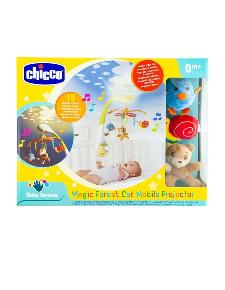 Baby will have a magical sleep The magic forest cot mobile is a forest-themed accessory for baby’s nursery or bedroom, Chicco’s cot mobile is ideal for entertaining and help settling your little one to sleep. Sweetly designed in bright colours, it comes complete with three adorable plush animal pendants (bear, bird and snail included) that can be removed for play or choose between three different functions as desired.