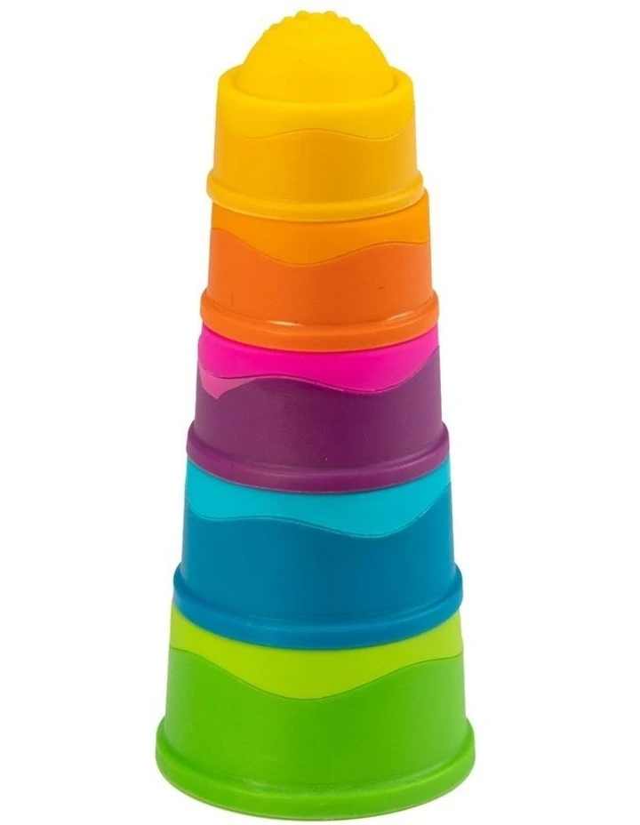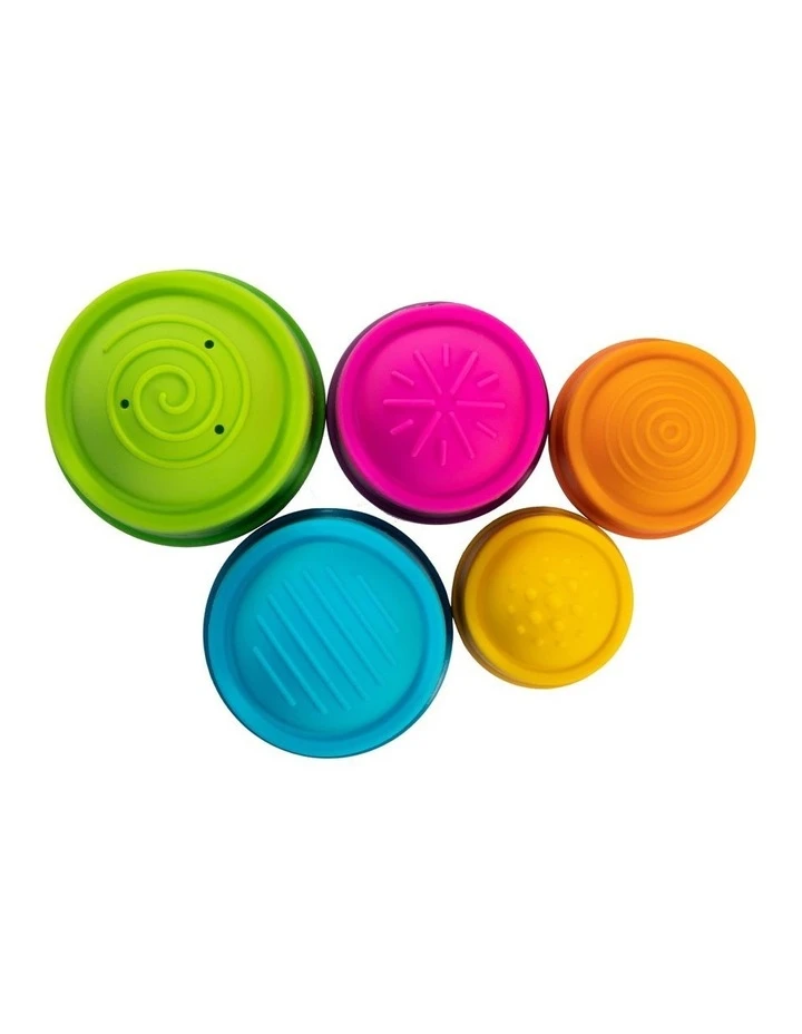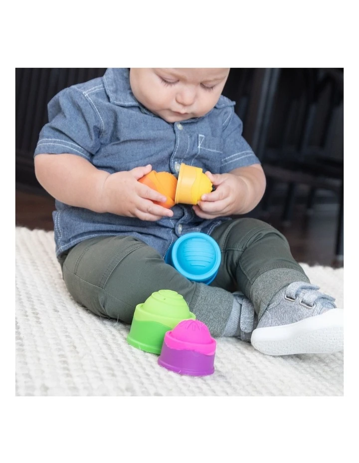 A vibrant stack-and-discover experience, The top of each cup features a squishy silicone bubble embossed with a unique texture pattern.