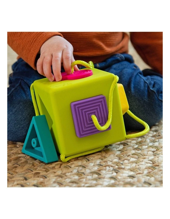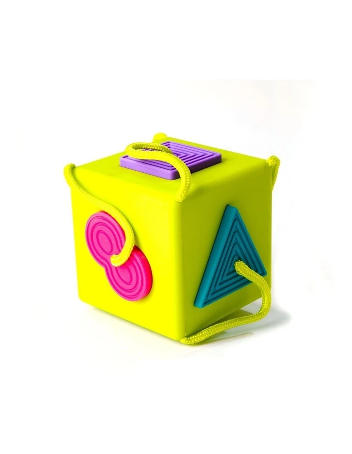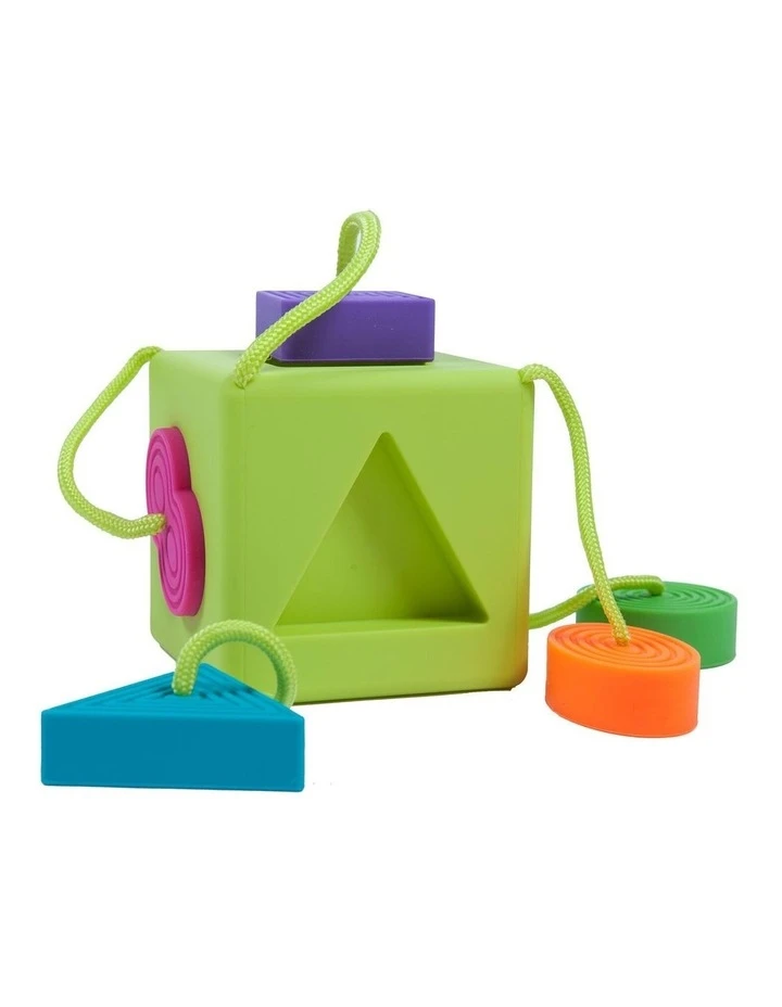 Grab, explore, sort, and discover, Little hands are immediately drawn to the six vibrant, textured, rubbery, tethered shapes. Explore their contours, give them a squeeze, and feel their textures – Made of 100% food-grade silicone, these shapes are wonderfully safe and durable! Then – Ready to start sorting? The cutout spaces of the cube each only match one of the rubbery tethered shapes.