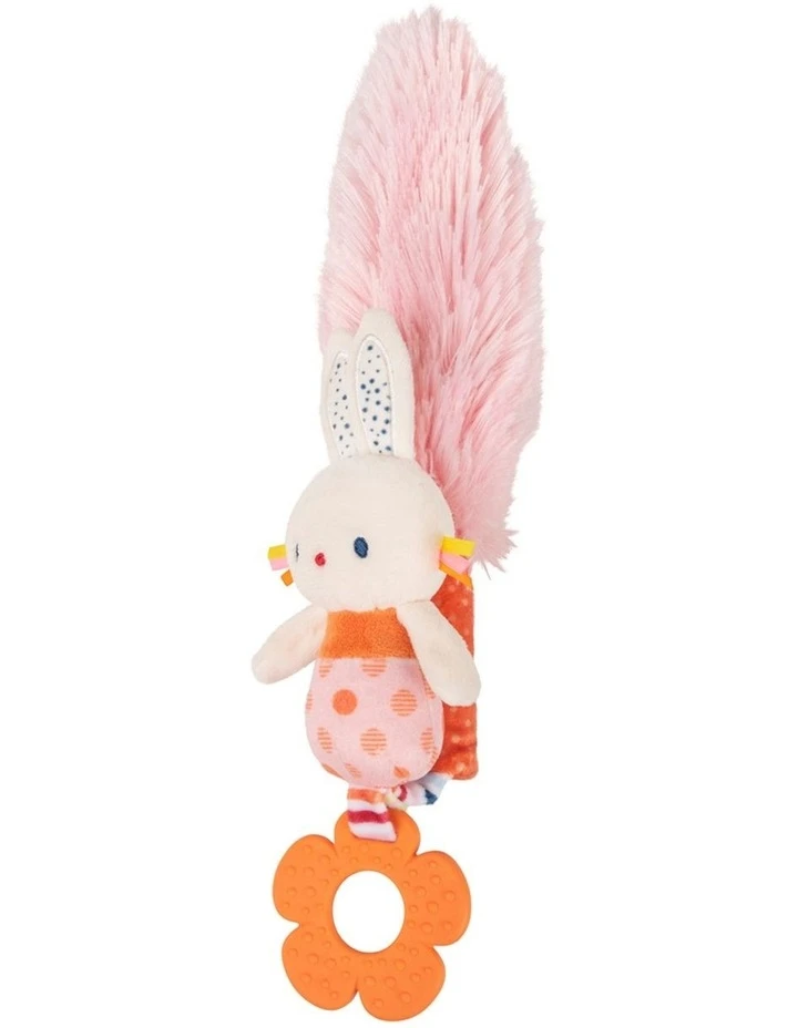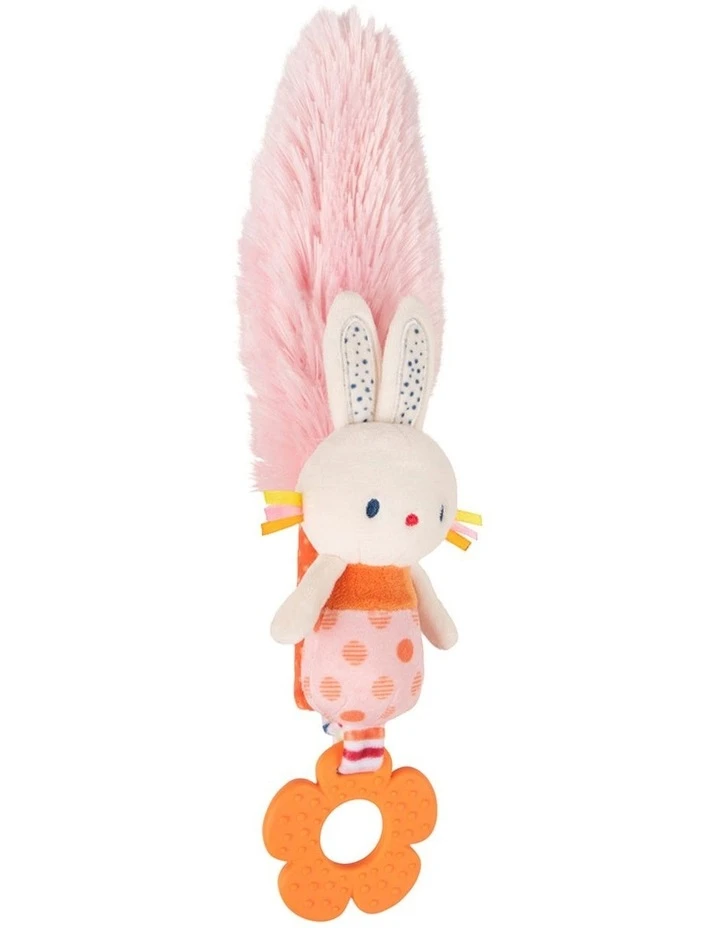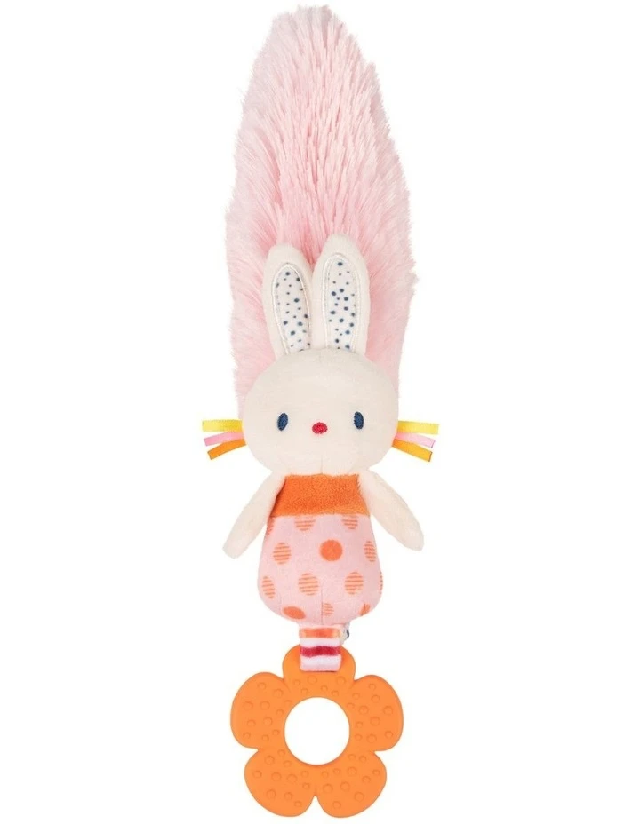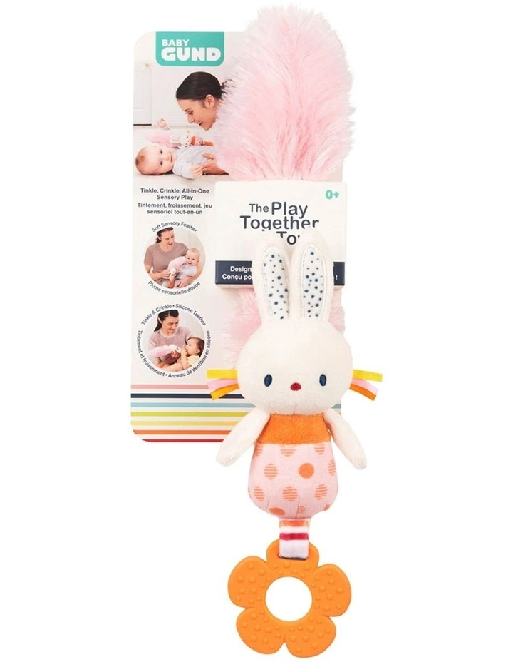 Presented on a branded backing card, this first toy for baby features a soft feather, crinkle, rattle, safe silicone teether and plush toy all in one! Designed to comfort, soothe and caress and with GUND’s signature softness, keep baby entertained with a tickler toy from the vibrant Tinkle Crinkle collection. Bunny ‘Play Together Toy’ features a bell inside its body, crinkly ears, a flower shape silicone teether and a soft and feathery pink tip.