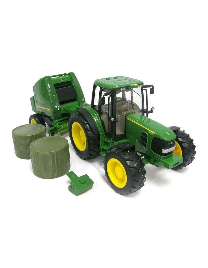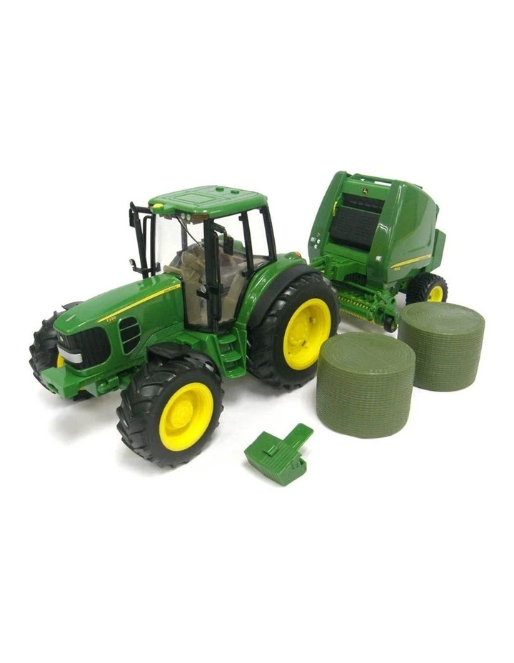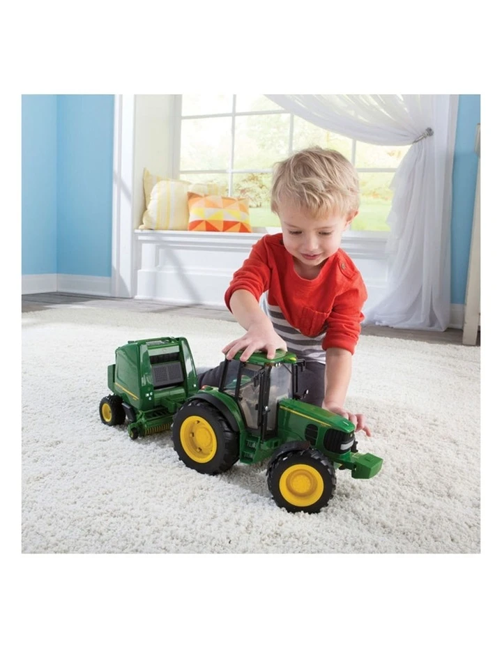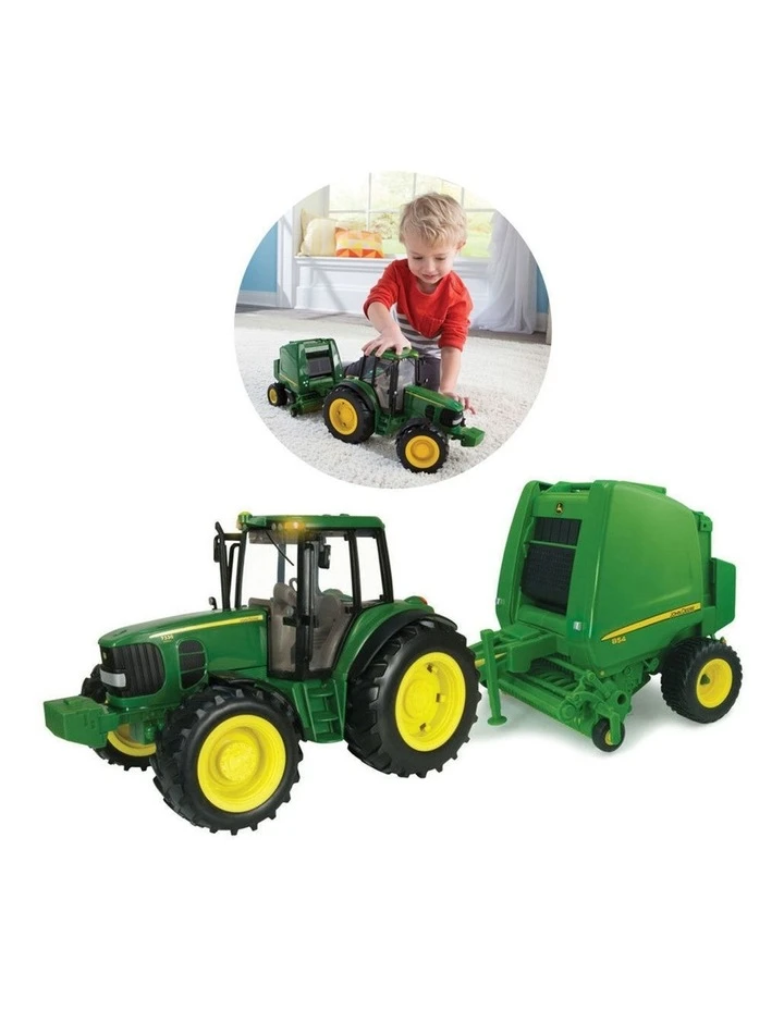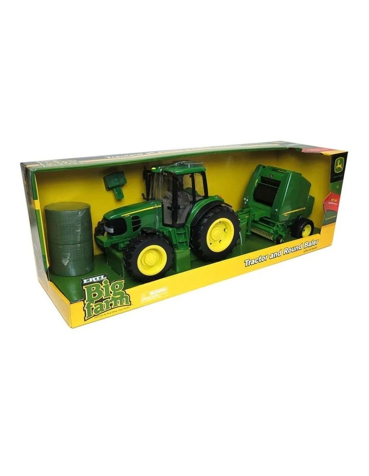 John Deere Tractor and Baler Set – Big Farm Series – High Impact ABS Plastic Ertl’s Big Farm 1:16 scale vehicles are the only line of off-road toys designed with loads of detail that features lights and sounds play action. The John Deere Tractor and Baler has a working steering wheel and comes with 3 AAA batteries. Recommended for ages 3 and up.