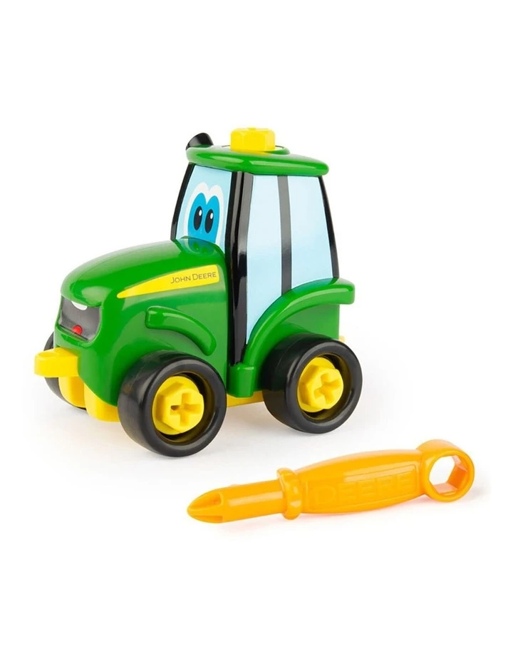Once put together, John Deere Build-A-Buddy Johnny Tractor’s free-rolling wheels are perfect for push-along play.