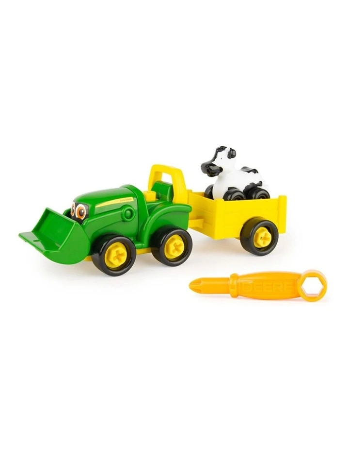 Includes wagon, push-along cow, and screwdriver that stores easily under the chassis