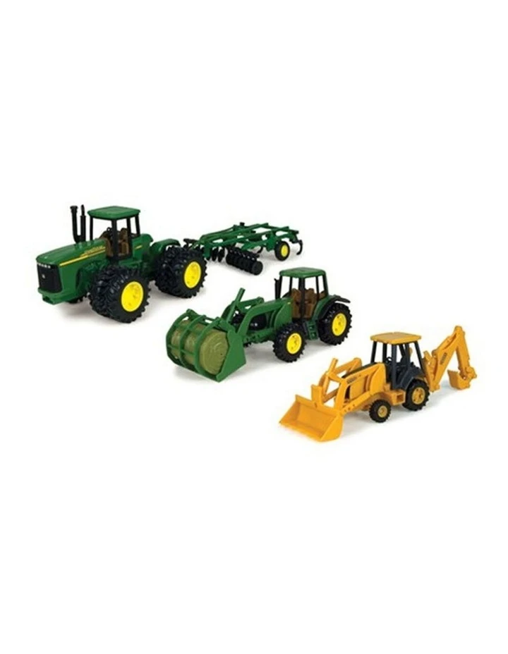 This incredible value set includes row crop tractor with removable front loader and bale backhoe, 4WD tractor with ripper, and four removable dual wheels.