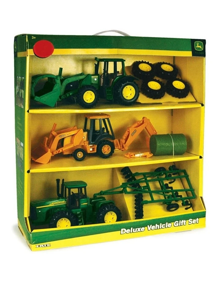 Each vehicle features die-cast and plastic parts in addition to free rolling wheels and authentic John Deere decoration.