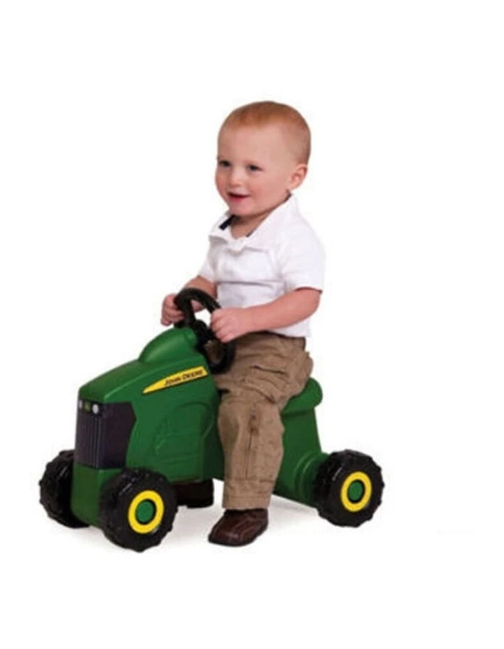 The John Deere foot to floor tractor features a wide base for great stability. This rugged plastic tractor has a narrow seat that makes it easy for tots to climb on and off. Your child provides the footpower, John Deere provides the fun!