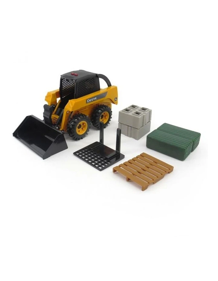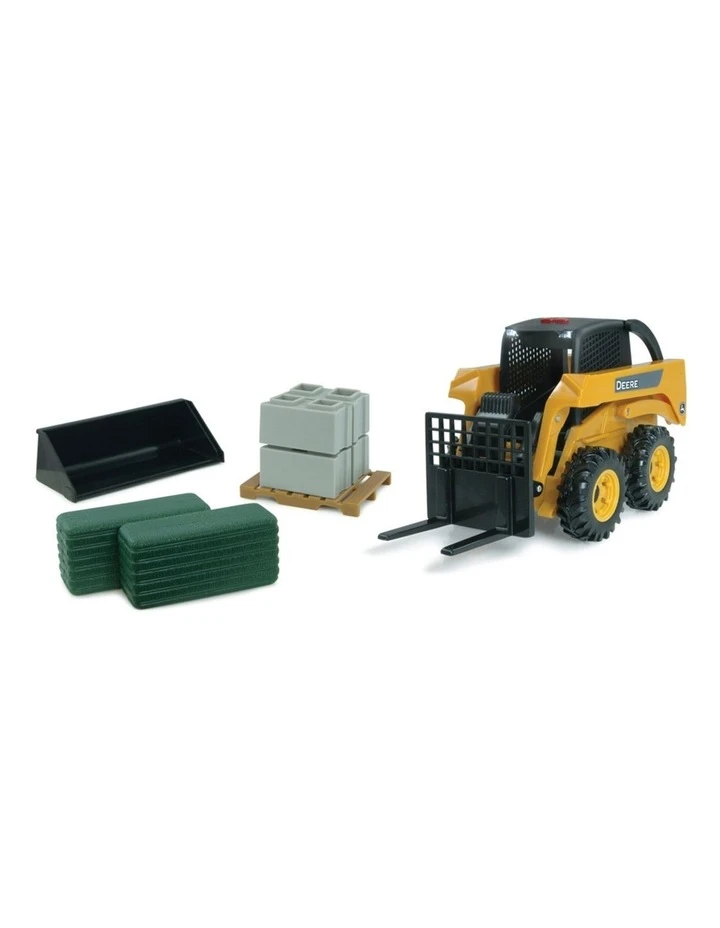 John Deere 1:16 Big Farm Skidsteer Set features 1/16 Skid steer with lights and sounds, bucket and fork, 2-square bales, and a pallet of bricks.