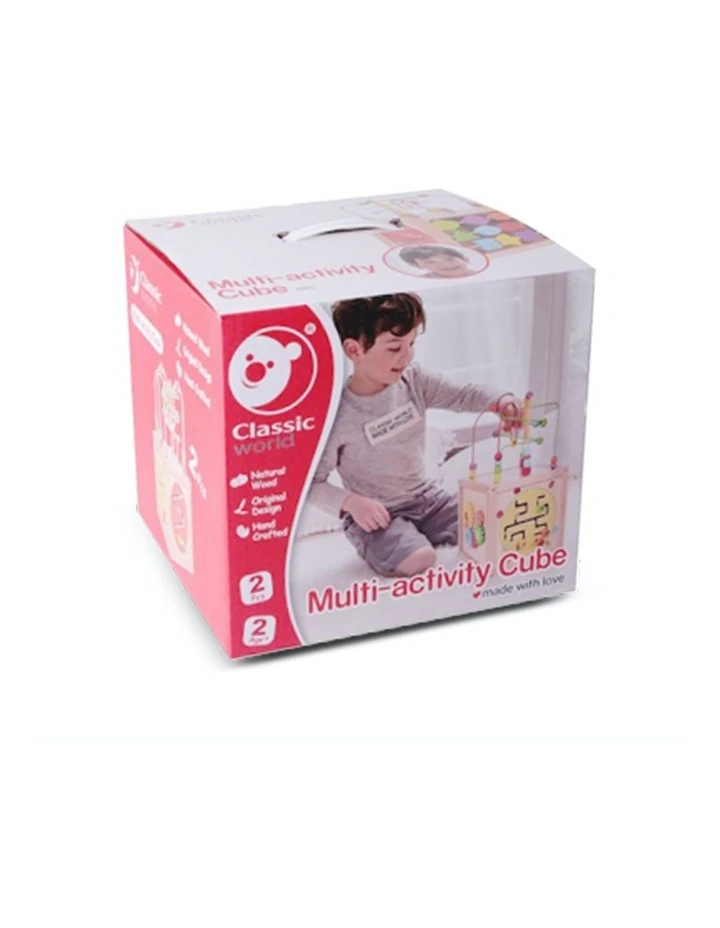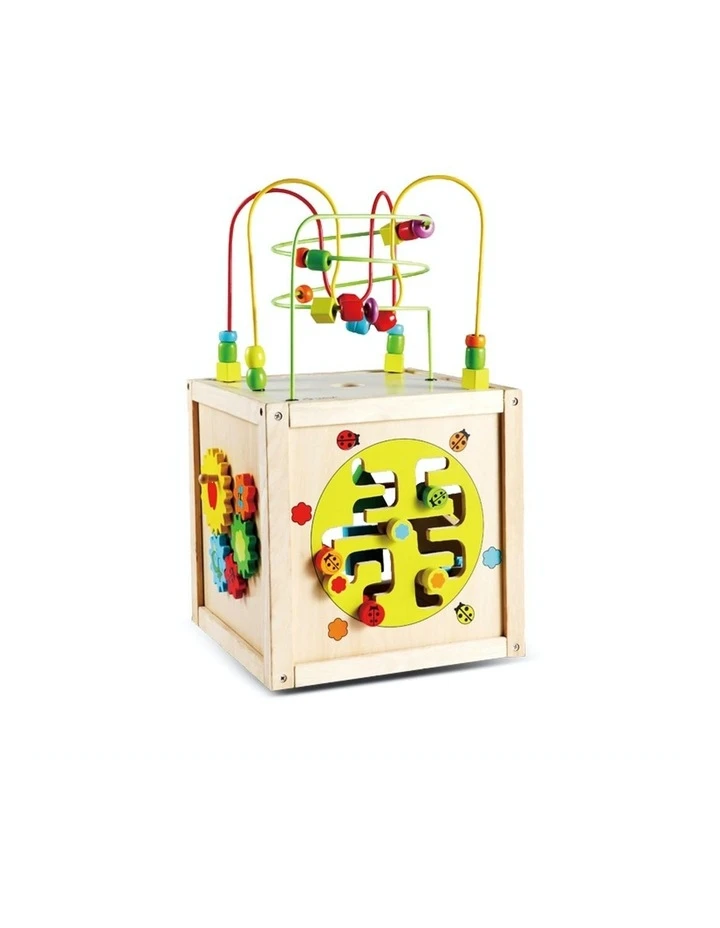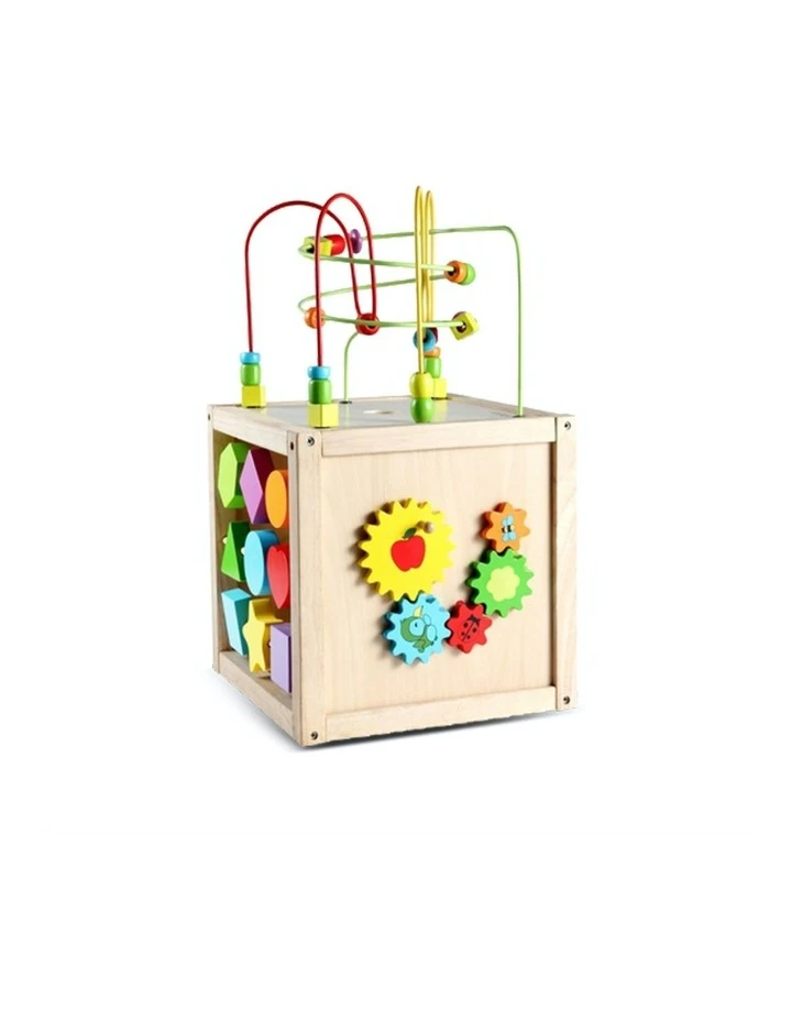 This wooden multi-activity cube toy is designed to help develop essential early learning skills in children. There are nine colorful geometric blocks on one side; on the opposite side is an interesting maze; on the right side there are five flower turn plates with gears.