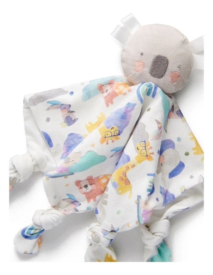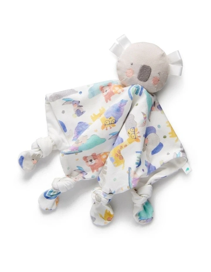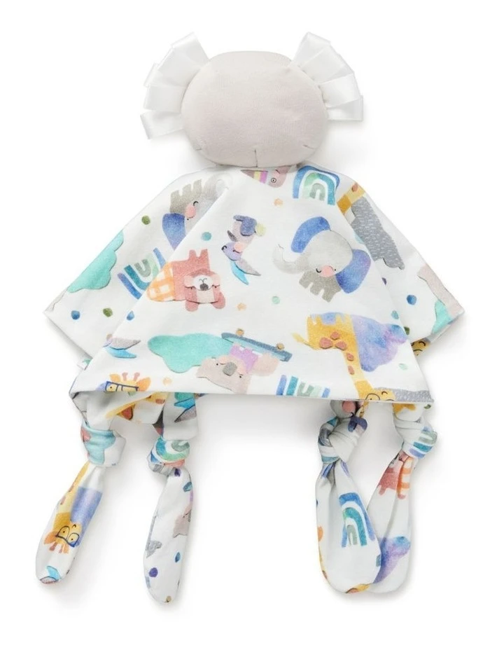 - Features: – Koala head with sensory ribbon tags for baby paired back with our soft organic jersey in animal pals print -Knotted ends are great for little chewers