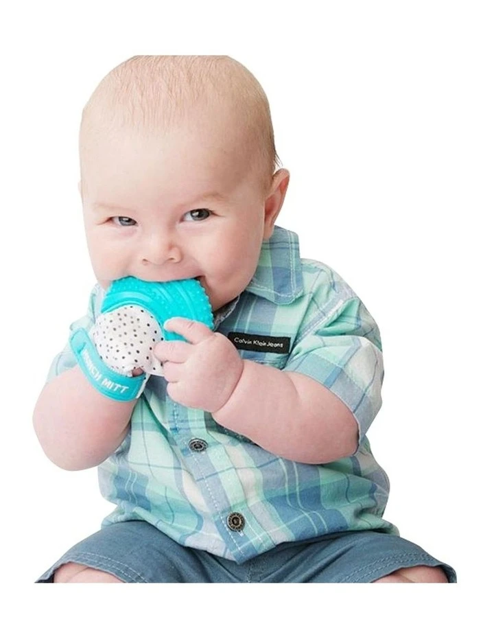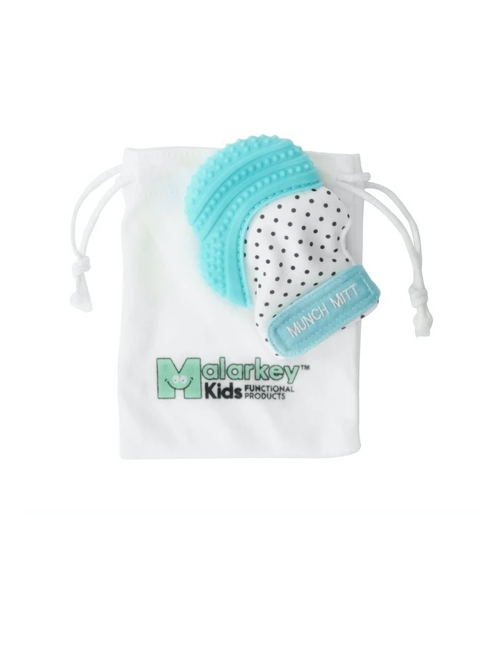 The Malarkey Kids Munch Mitt is the original, mom-created teething mitten that babies love. A handy solution for infants of all ages and sizes, the Munch Mitt provides relief from teething pain in a safe, easy-to-clean product that goes wherever they do. Suggested age range 3-7 months. The Munch Mitt is made from 100% food-grade silicone and is BPA and phthalate-free. The textured flexible silicone surface provides soothing teething relief. It has a secure adjustable strap and protects babys hands from excess saliva and chewing. It also comes with a washable travel pouch.