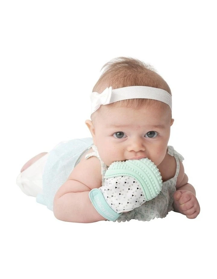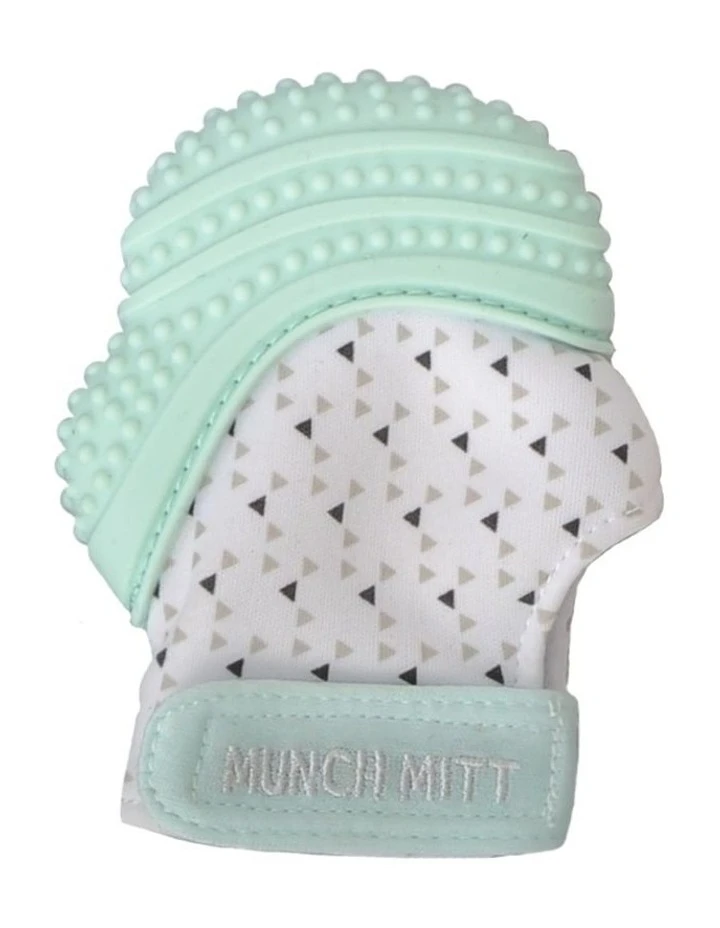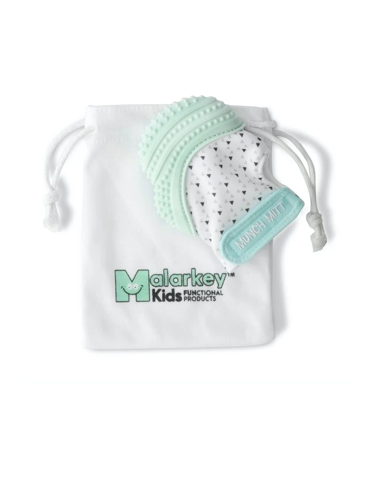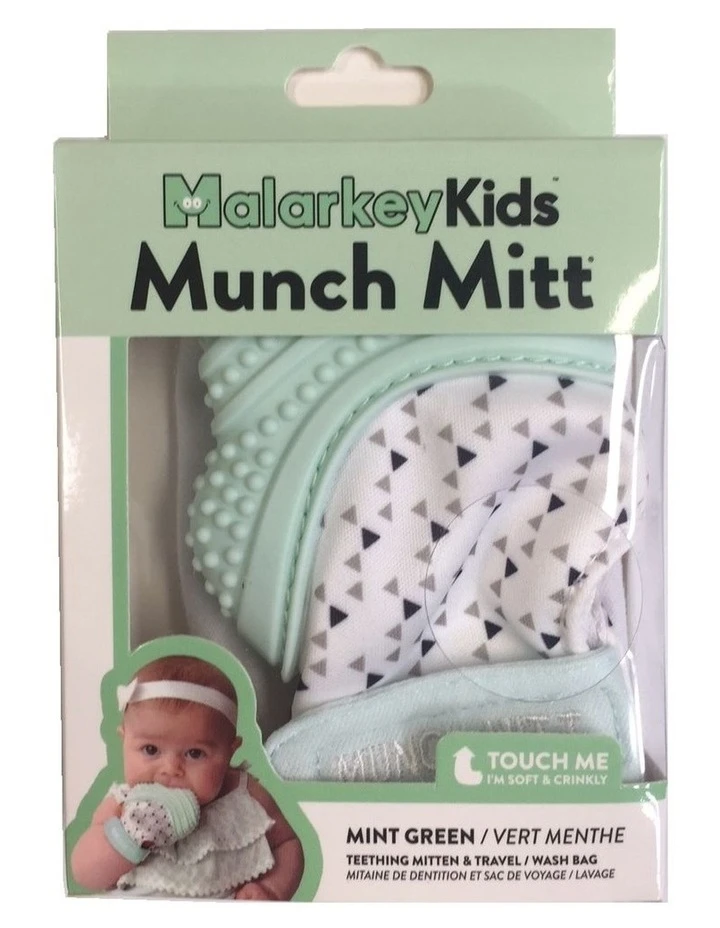 The Malarkey Kids Munch Mitt is the original, mom-created teething mitten that babies love. A handy solution for infants of all ages and sizes, the Munch Mitt provides relief from teething pain in a safe, easy-to-clean product that goes wherever they do. Suggested age range 3-7 months. The Munch Mitt is made from 100% food-grade silicone and is BPA and phthalate-free. The textured flexible silicone surface provides soothing teething relief. It has a secure adjustable strap and protects babys hands from excess saliva and chewing. It also comes with a washable travel pouch.