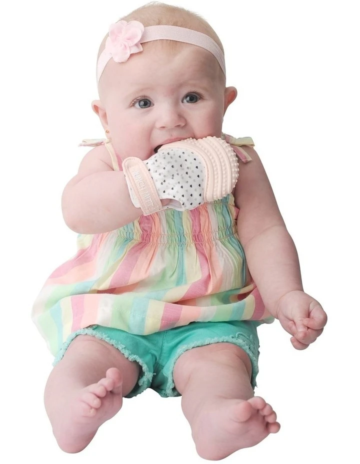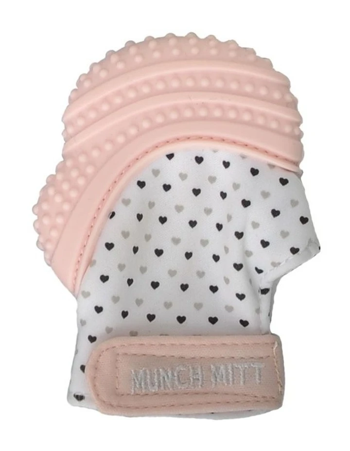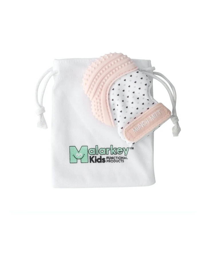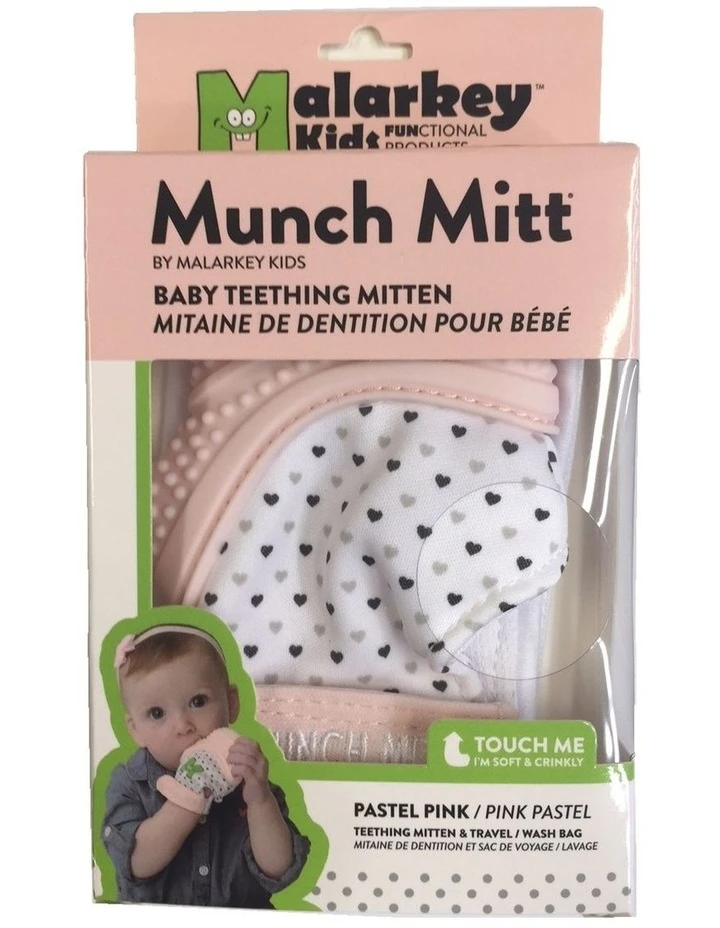 The Malarkey Kids Munch Mitt is the original, mom-created teething mitten that babies love. A handy solution for infants of all ages and sizes, the Munch Mitt provides relief from teething pain in a safe, easy-to-clean product that goes wherever they do. Suggested age range 3-7 months. The Munch Mitt is made from 100% food-grade silicone and is BPA and phthalate-free. The textured flexible silicone surface provides soothing teething relief. It has a secure adjustable strap and protects baby’s hands from excess saliva and chewing. It also comes with a washable travel pouch.