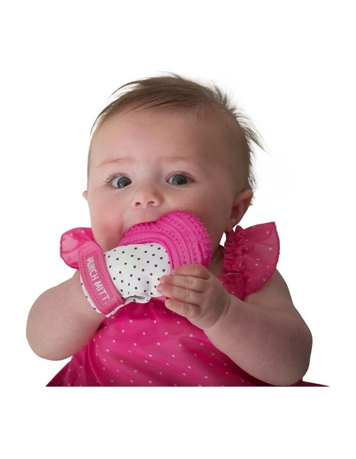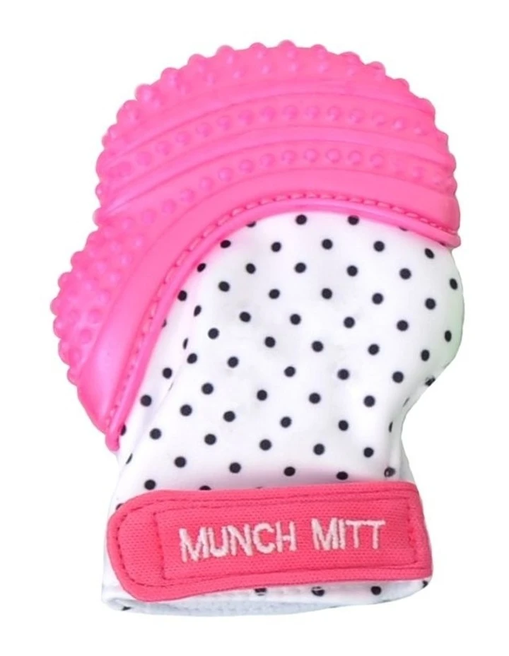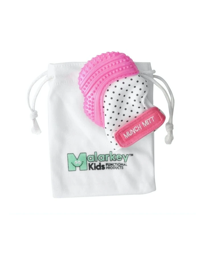 The Malarkey Kids Munch Mitt is the original, mom-created teething mitten that babies love. A handy solution for infants of all ages and sizes, the Munch Mitt provides relief from teething pain in a safe, easy-to-clean product that goes wherever they do. Suggested age range 3-7 months. The Munch Mitt is made from 100% food-grade silicone and is BPA and phthalate-free. The textured flexible silicone surface provides soothing teething relief. It has a secure adjustable strap and protects babys hands from excess saliva and chewing. It also comes with a washable travel pouch.