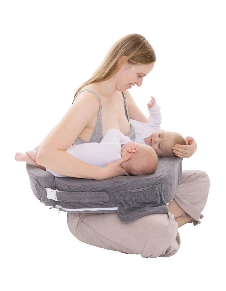 This pillow was designed for one purpose to properly support mum and twin babies during breast feeding. The back rest helps maintain good posture during feeding, preventing sore backs and necks. Wrap around design secures to the body, helping mum and babies maintain ideal positioning and latch on. Arms and elbow rest eliminating shoulder stress. Convenient pocket for nursing and other accessories. Firm flat front cushion, eliminates the gap between you and your babies, which keeps the babies from rolling away with adjustable straps. The cover is easily removable and machine washable.