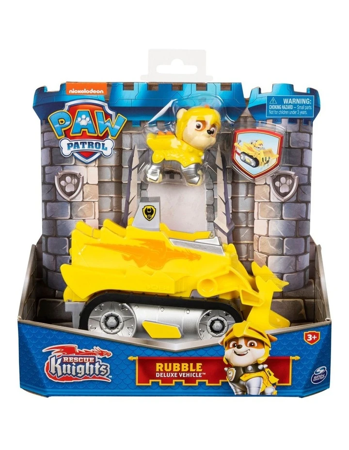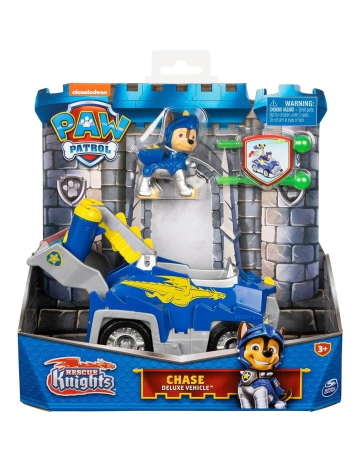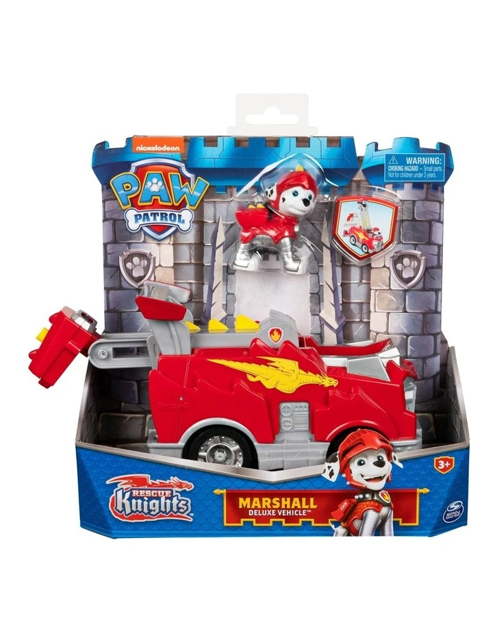 Team up with the Pups for exciting missions with PAW Patrol Rescue Knights transforming Deluxe Vehicle! Each vehicle features dragon-inspired details and styling and an exciting rescue tool transformation. Geared up in their Rescue Knights armor, each pup (collectible action figure included) is ready to save the day in Barkingburg. Explore your imagination to create awesome medieval rescues, just like the ones from the hit TV show. For more dragon-sized fun, look for the Castle HQ and collect all the PAW Patrol Rescue Knights Deluxe Vehicles (playset and toy vehicles each sold separately)! Gear up for rescue missions with the Pups and their Rescue Knights Deluxe Vehicle!