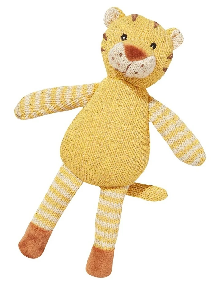 With stripey arms and a soft tummy, this knitted tiger has a rattle inside, providing plenty of sensory entertainment. Teddy the Tiger has a hint of sparkle, and velour feet.