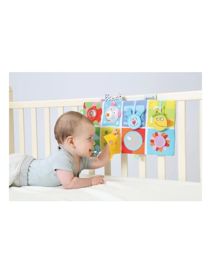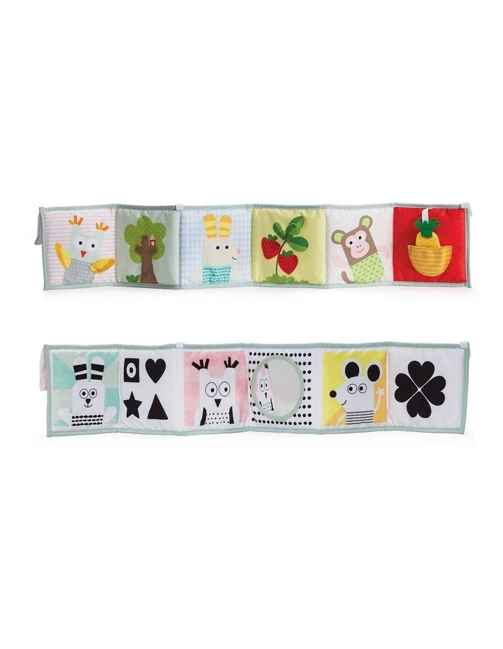 Double-sided soft book for two developmental stages. Suitable for use in the cot or pram, and for tummy-time play. Details: 2 sides for 2 development stages includes: baby-safe mirror, crinkling shapes, 3D activities and textured fabrics with pineapple teether toy and play pocket stands up alone for tummy-time play. Size: 14 x 85cm