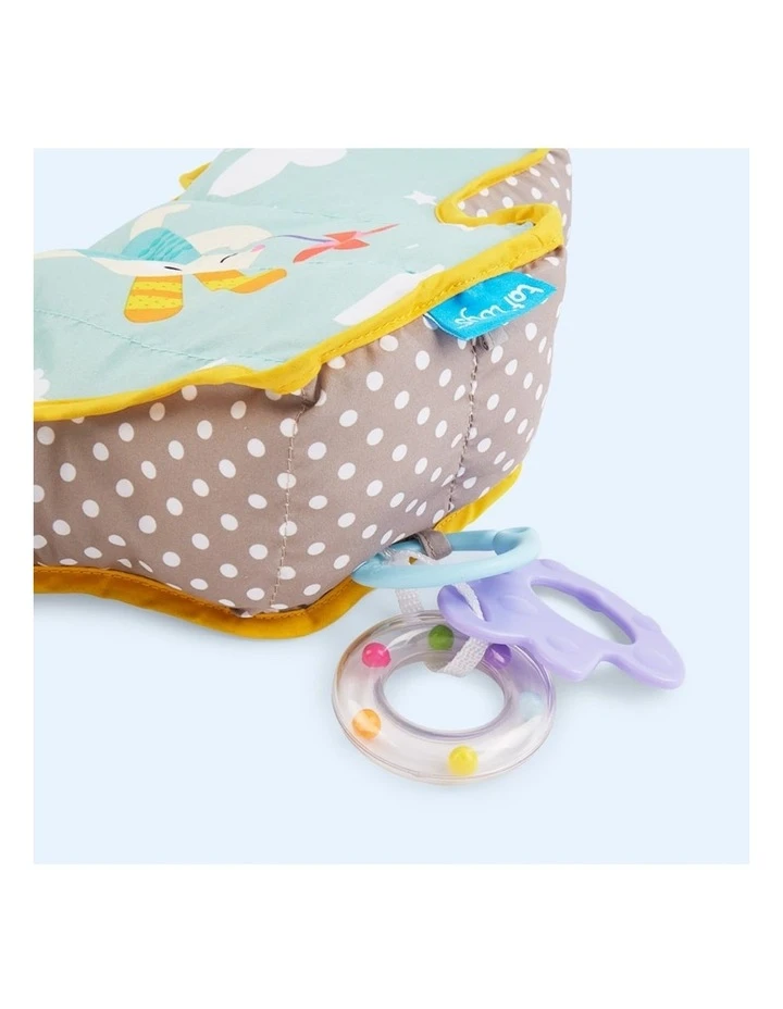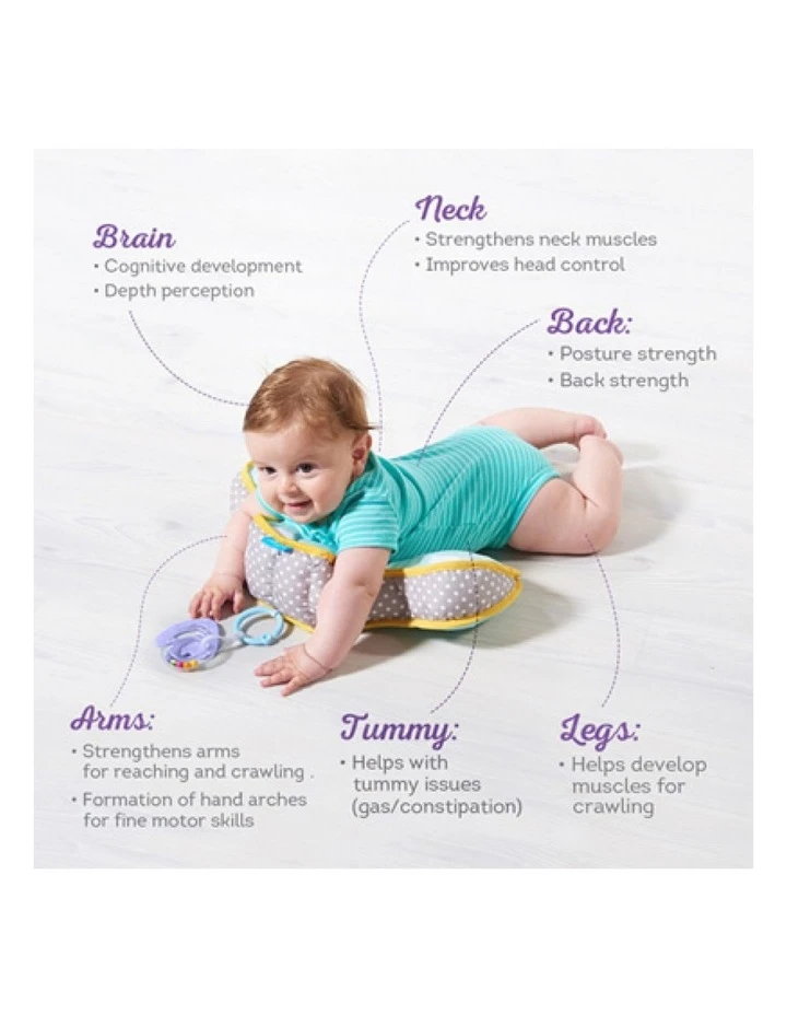This uniquely designed tummy -time pillow has the added bonus of a teether and rattle toy. Designed for tummy-time and to encourage babys lifting up of head & neck.