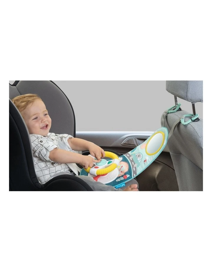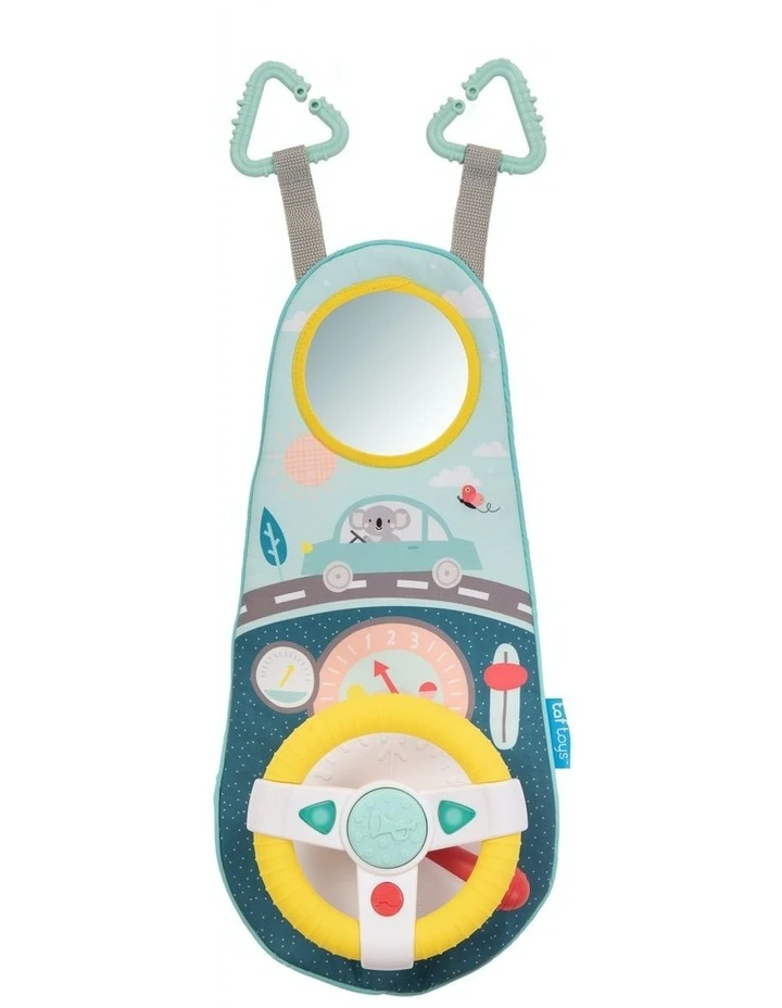 Taf Toys Koala Car Wheel Toy will make travelling by car fun and entertaining for your front facing toddler. With a steering wheel and gear lever, plus sounds and lights, your little one will be delighted with his next long car journey. Other features include car sounds, fun melodies and clicking sounds and a baby-safe mirror. The toy easily attaches to your cars head rest. Do not use for rear-facing babies. Batteries: AAx2 (not included)