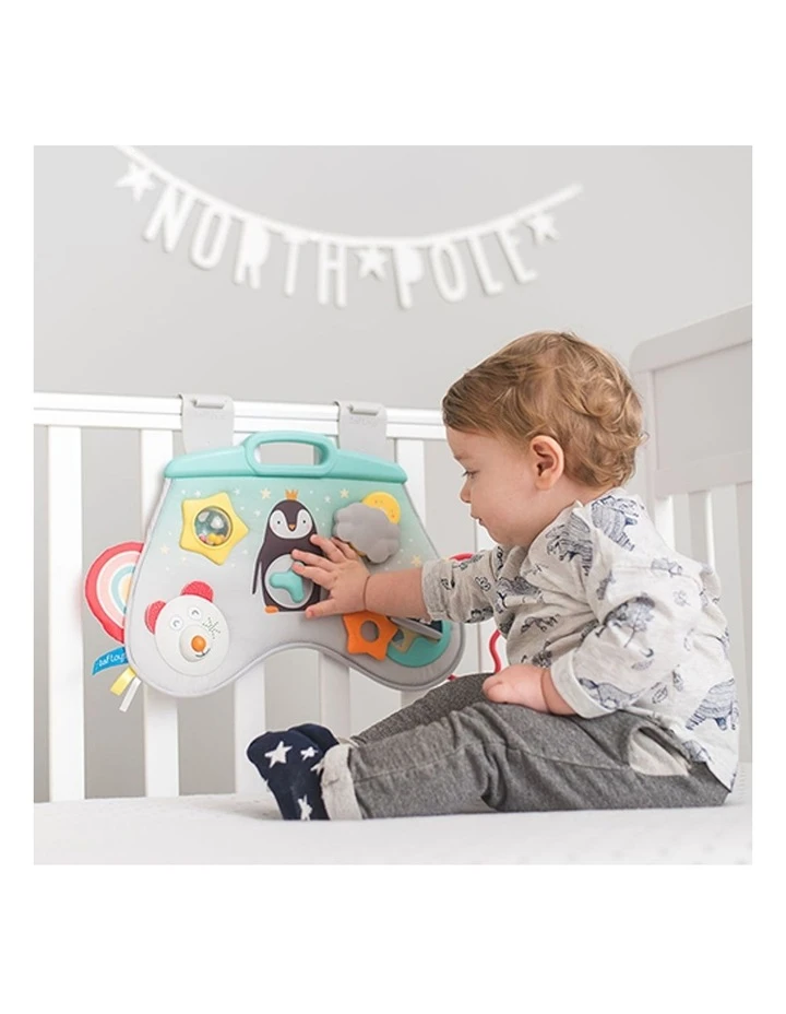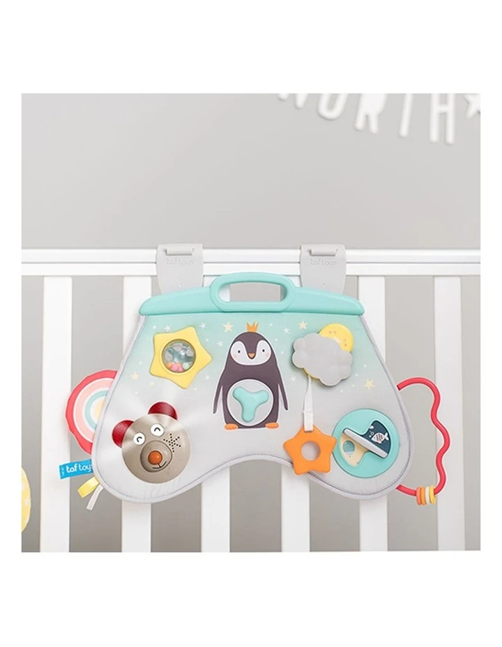 The perfect activity toy that grows with your baby. Suitable for use in the crib, on the play mat or just about anywhere. The activity toy hangs on wooden or fabric cots with two clips, in two height options. Includes 12 activities for play and exploration -music & lights, pick-a-boo activities, rattling clear ball, crinkling parts, mini maze with colourful rings and more. With easy-to-grab handle, for babies to take along wherever they go. Batteries: 2 X AAA (not included).