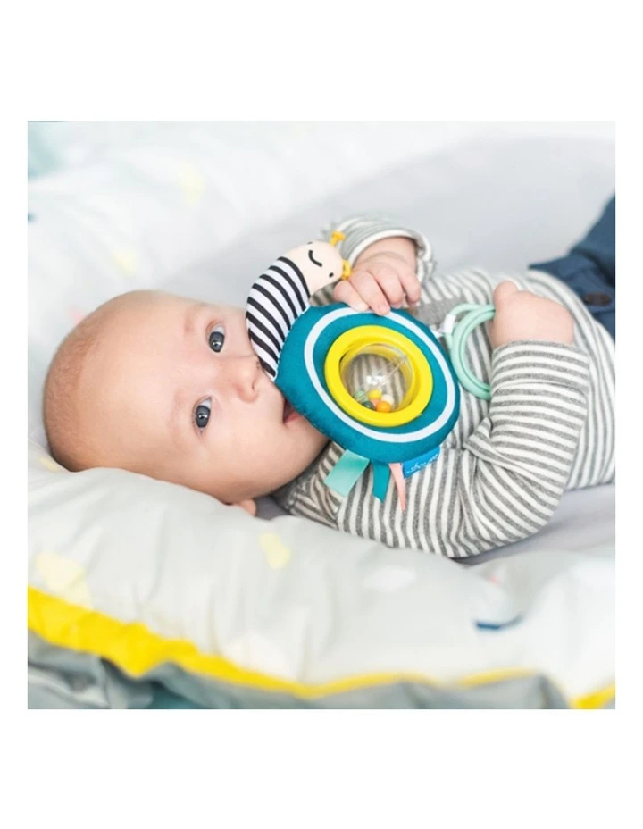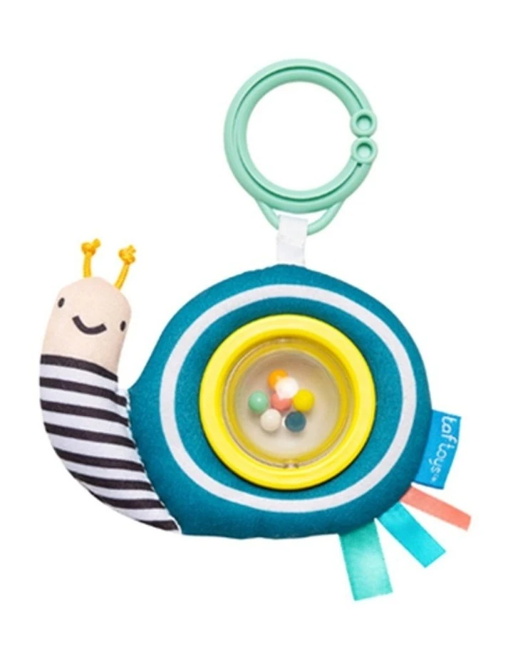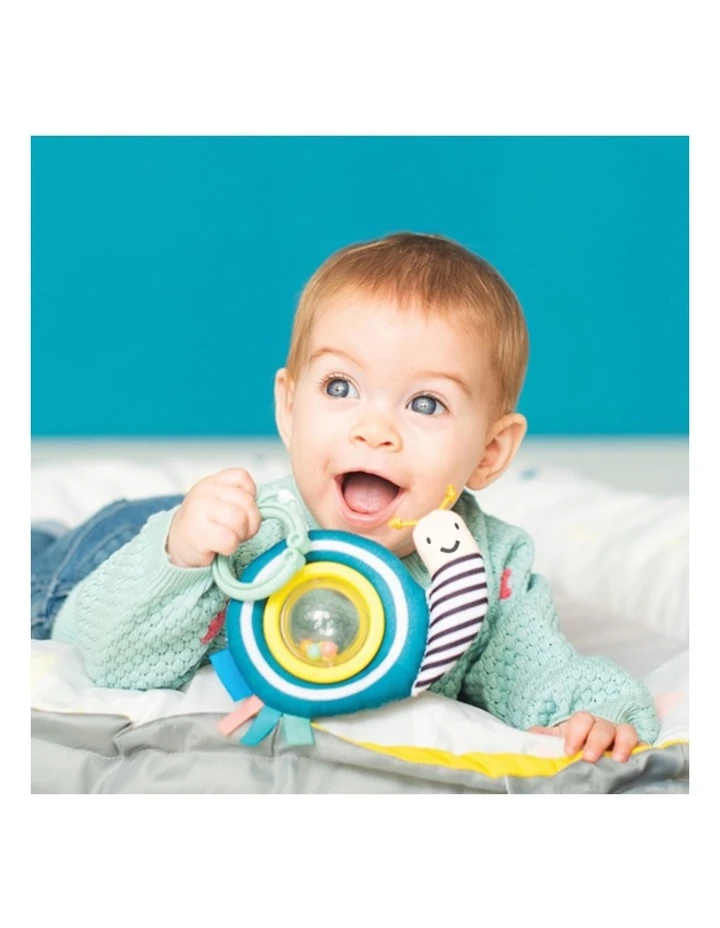 A rotating clear ball rattle with colourful beads and ribbons. Measurements: 16cm