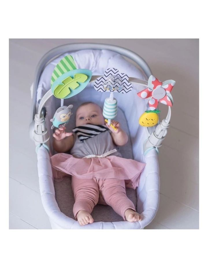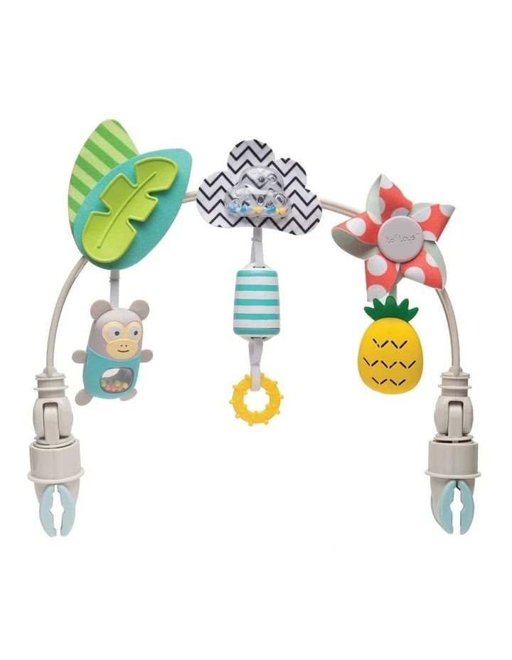 Flexible pram arch with fascinating instrumental toys, to stimulate baby’s discovery of sounds. Features include: flexible arch, variety of instrumental toys, maracas monkey, chime bells toy with a teether and cymbal pineapple toy. The sturdy arch clips fits most strollers, prams, car seats and bouncers.