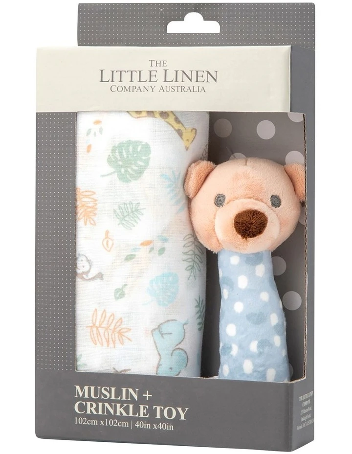 Wrap up your bub in a Printed Cotton Muslin and let them cuddle, snuggle and squeeze one of Australia’s favourite friends a coordinating sensory Plush Crinkle Toy. Conveniently already boxed as a gift set by The Little Linen Company.