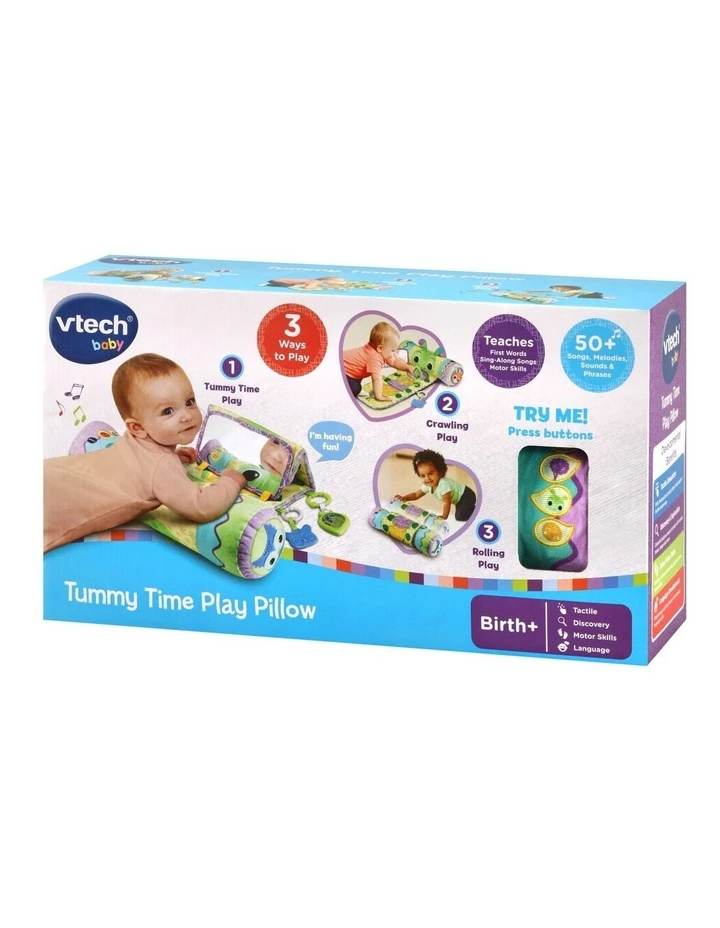 Take tummy time play to the next level with the Tummy Time Play Pillow by VTech! With three ways to play, this soft caterpillar encourages your babys development from tummy time to crawling to rolling play.