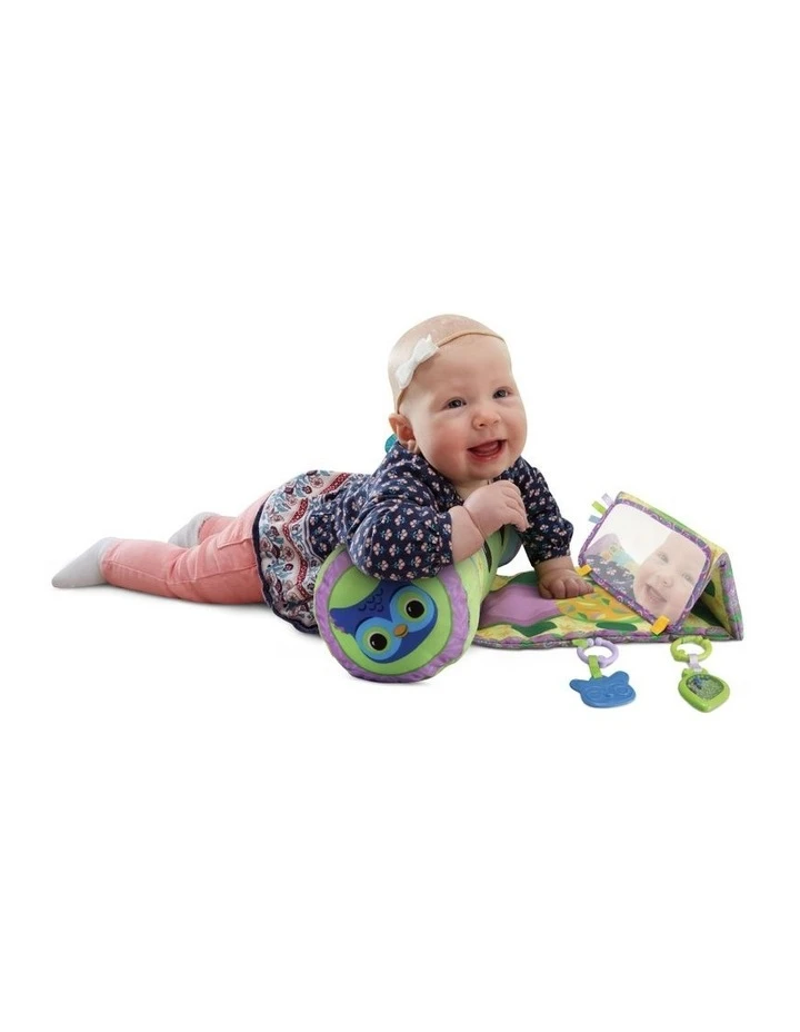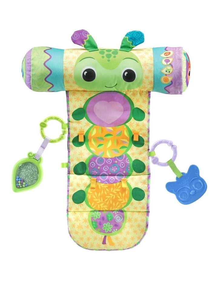 When your little one enjoys tummy time on the rolled-up caterpillar, neck, shoulder and back muscles are strengthened as they look in the peek-a-boo mirror and reach for the leaf rattle and owl teether toy. Unroll the caterpillar to reveal an attached playmat with soft padded fabric and ribbon tags to explore and crawl on.