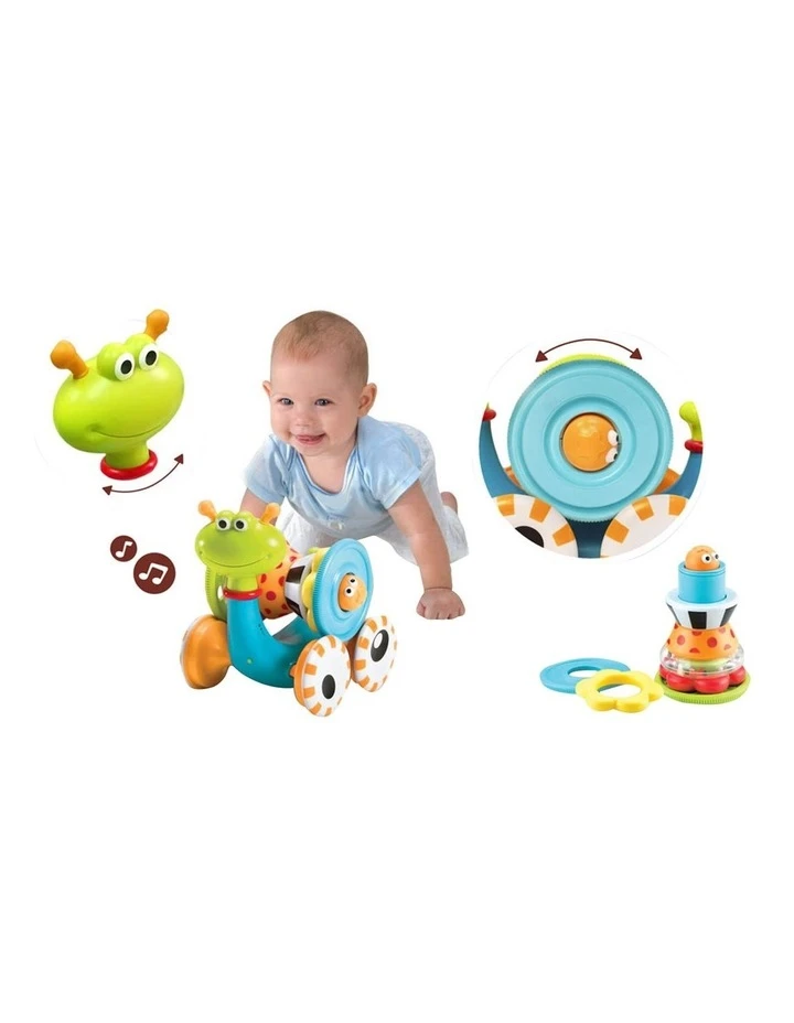 A musical battery-operated snail that rolls, spins his shell and turns his head from side to side as he goes – encouraging baby to crawl.2 toys in 1: spinning shell unscrews to become a 7 piece ring stacker toy with a push-squeaker face and a rattle ring.Baby friendly tail operation button.Parent on/off button for silent play mode.With every activation the snail will rolls approx. 6.5 feet (2 meters) rewarding and motivating baby to catch and reactivate.